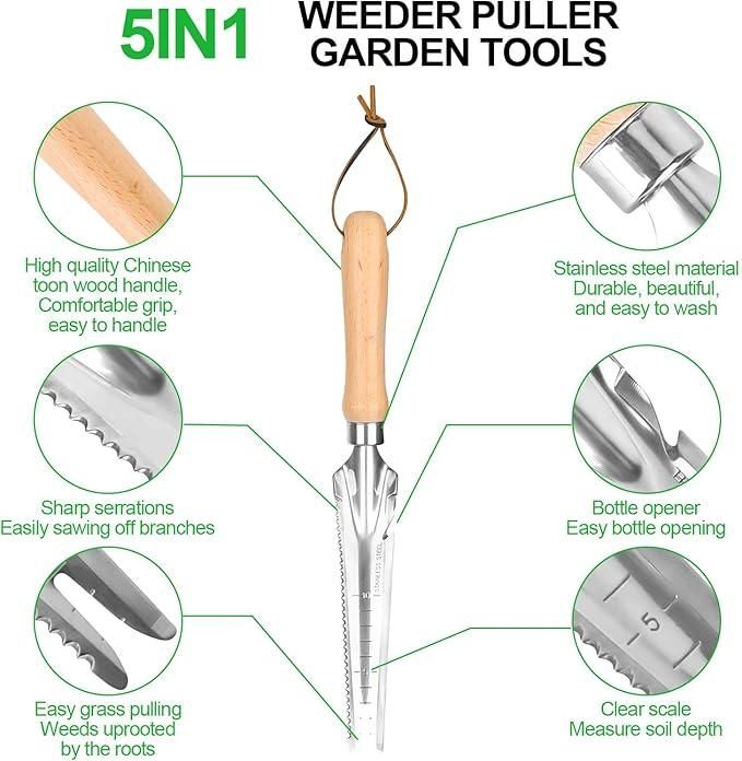 This weed tool is not only used for removing deep-rooted weeds, but is also suitable for transplanting, cutting, sawing, scooping, soil loosening, measuring, etc.